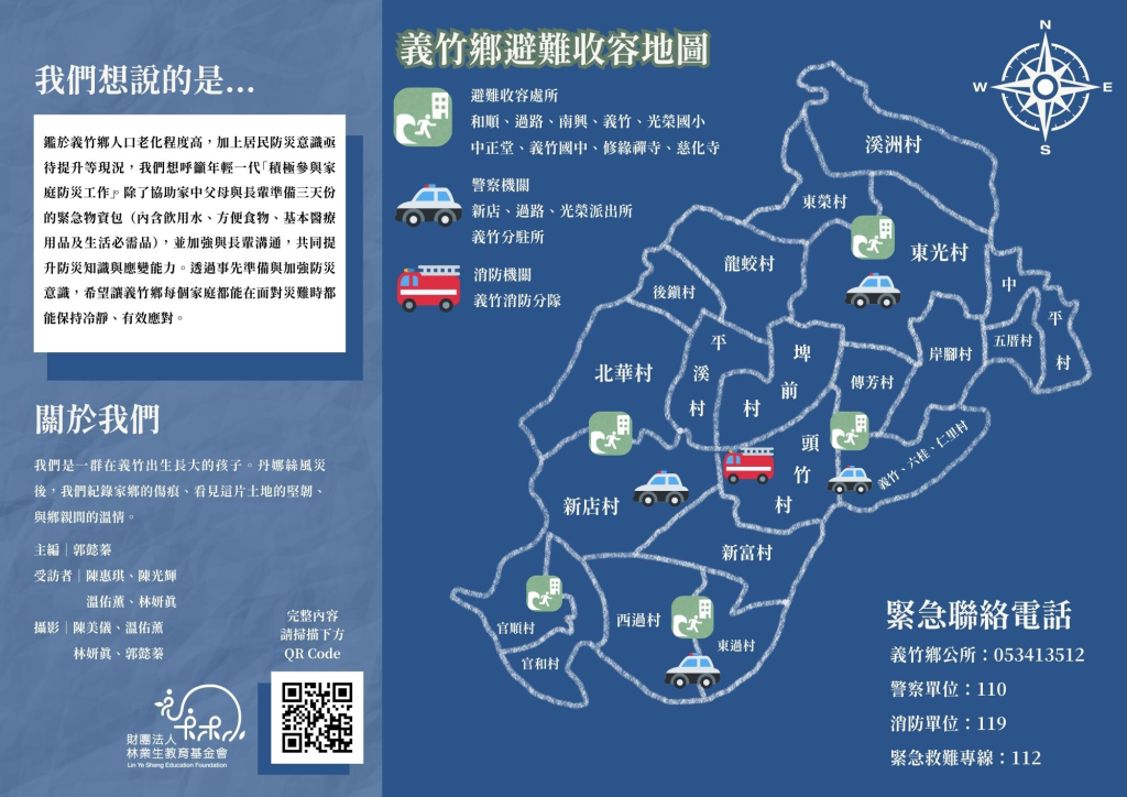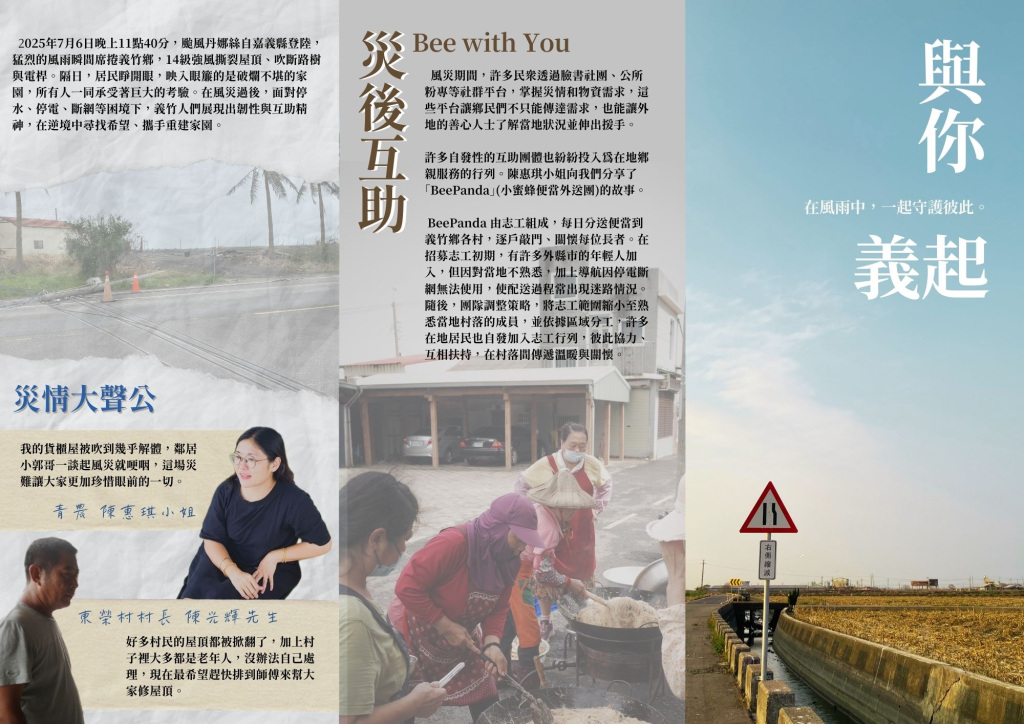 本次出版的《與你義起》災後紀實三折頁,不僅記錄了風災的經歷,更附上了義竹鄉的緊急避難收容所、警消單位位置與緊急聯絡電話,期盼能在緊急時刻成為居民的助力,陪伴每位義竹人共同度過所有艱難時刻。